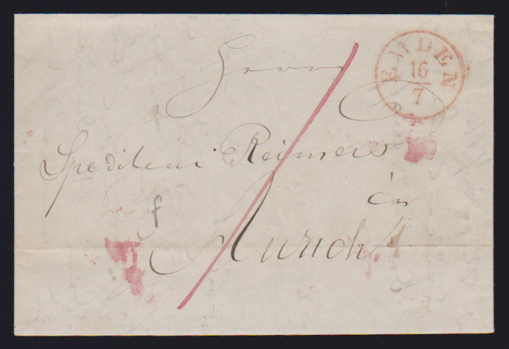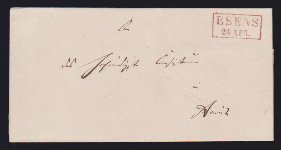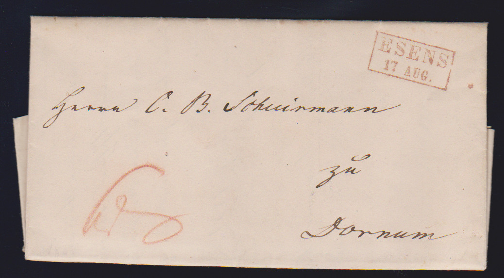 "Esens", 1851, roter Ra2 auf zwei Kabinettbriefen nach Aurich bzw. Dornum, dazu als Ankunftsstempel auf Brief mit K1 "AURICH", ArGe je 150,-