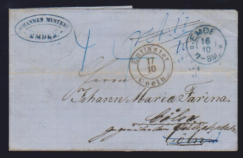 "Emden", 1864, blauer K2 nebst schwarzem K2 "ENTLASTET COELN" auf Retourbrief nach Köln (neu versandt mit korrekter Adresse)