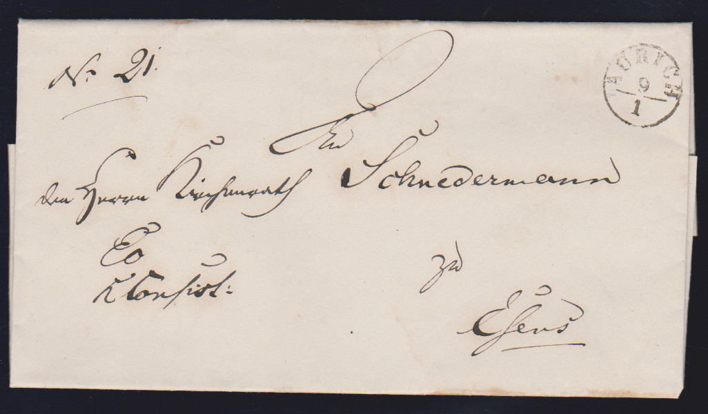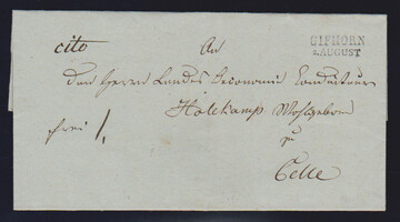 "Geestendorf", 1835, sauberer L1 (ArGe 02) auf kleinem Brief aus Charleston/USA nach Sandstett/Amt Hagen (Laufzeit 6.7. bis 13.10. 1835), hs. "Dieses FREY kann nicht in Aufschlag kommen, da der Brief aus Amerika kommt" und "2 Ggr. Ausl.:"