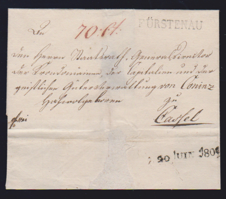 "Fürstenau", 1809, 20.6., seltener L1 klar auf Kabinettbrief (Hülle) nach Cassel, rs. Datums-L1 "20. JUN. 1809", ArGe 01