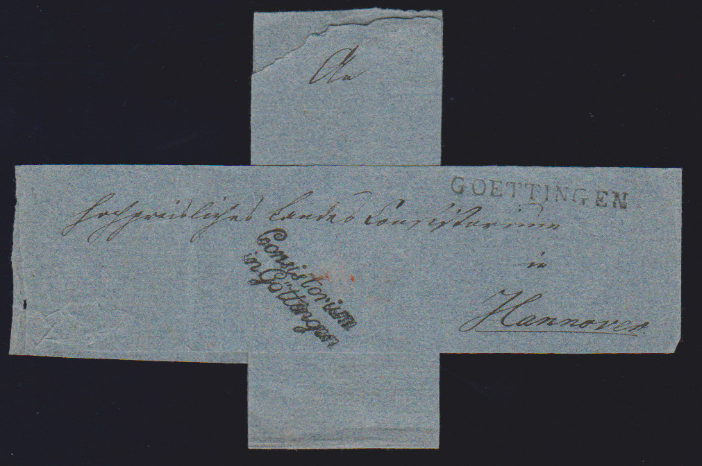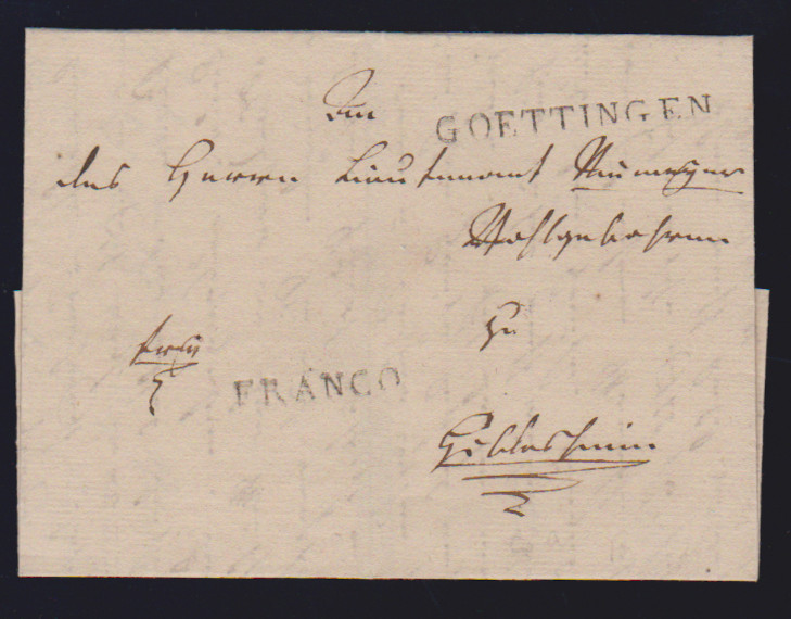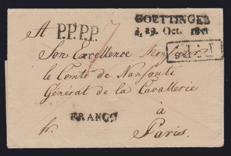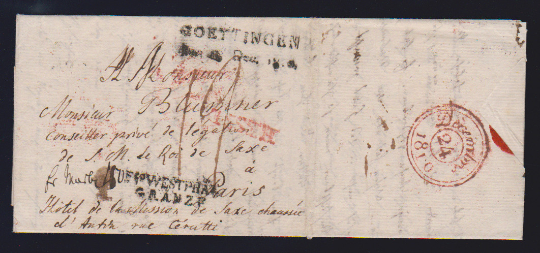 "Goettingen", 1810/1811, leicht rußige L2 auf zwei Briefen nach Paris (einmal mit L2 "FCO. WESTPHAL. GRÄNZE" nebst rotem L1 "HESSE")