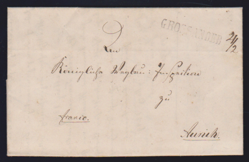 "Grossander", ca. 1830-1860, schwarzer, blauer und roter L1 sowie blauer K2 auf vier Prachtbriefen (ein Paketbrief mit Label)