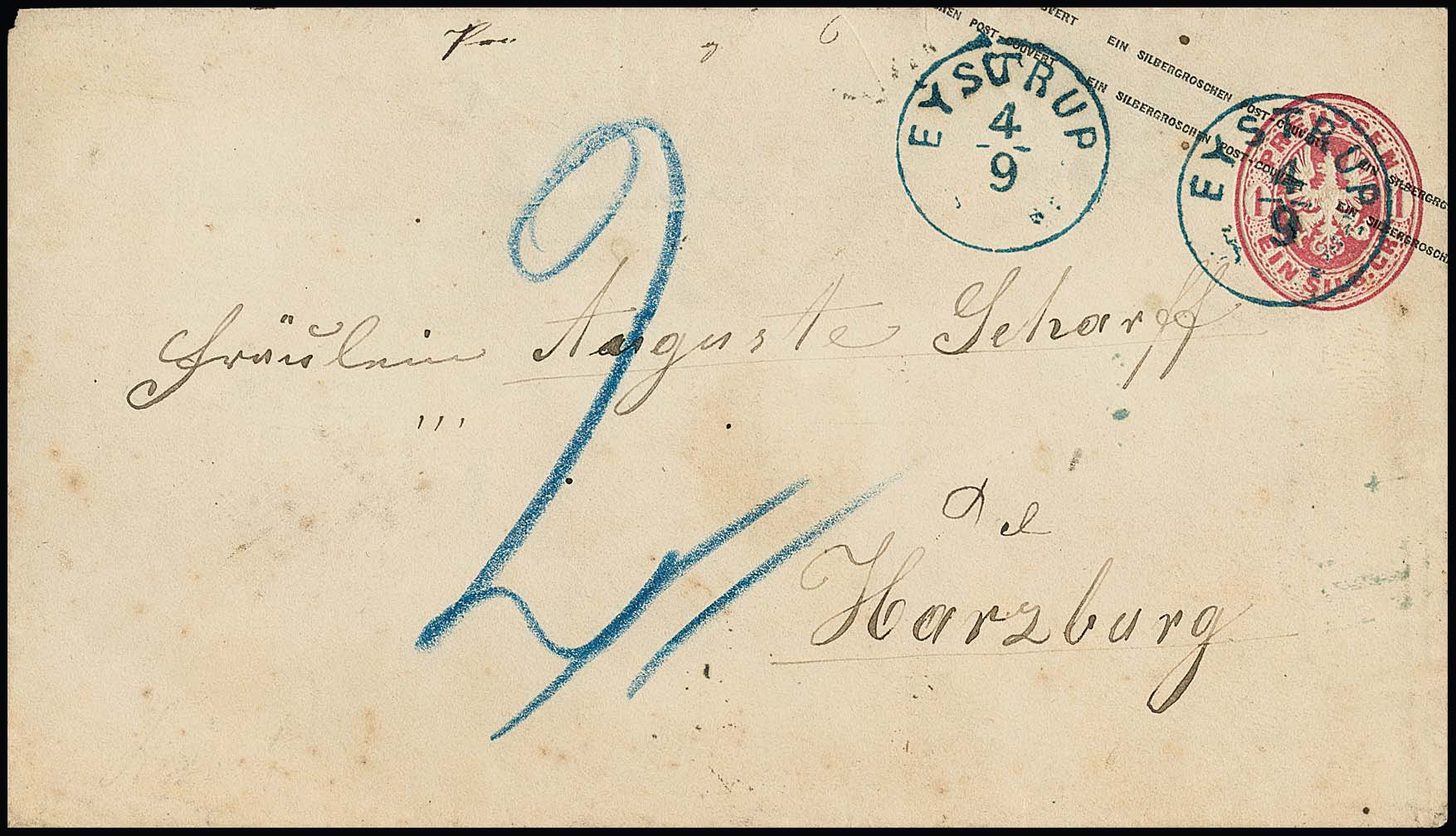 "Eystrup", nachverw. K1 klar auf Ganzsache Preußen 1 Sgr. rosa nach Harzburg (Nachtaxe "2"), rs. K2 "Braunschweig" und hs. "2 Gr."