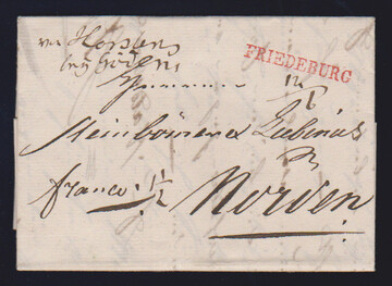 "Friedeburg", 1834, roter L1 (ArGe 02) klar auf kleinem Luxusbrief nach Norden, hs. "VON HORSENS BEY GÖDENS", seltener Briefsammlungsbeleg