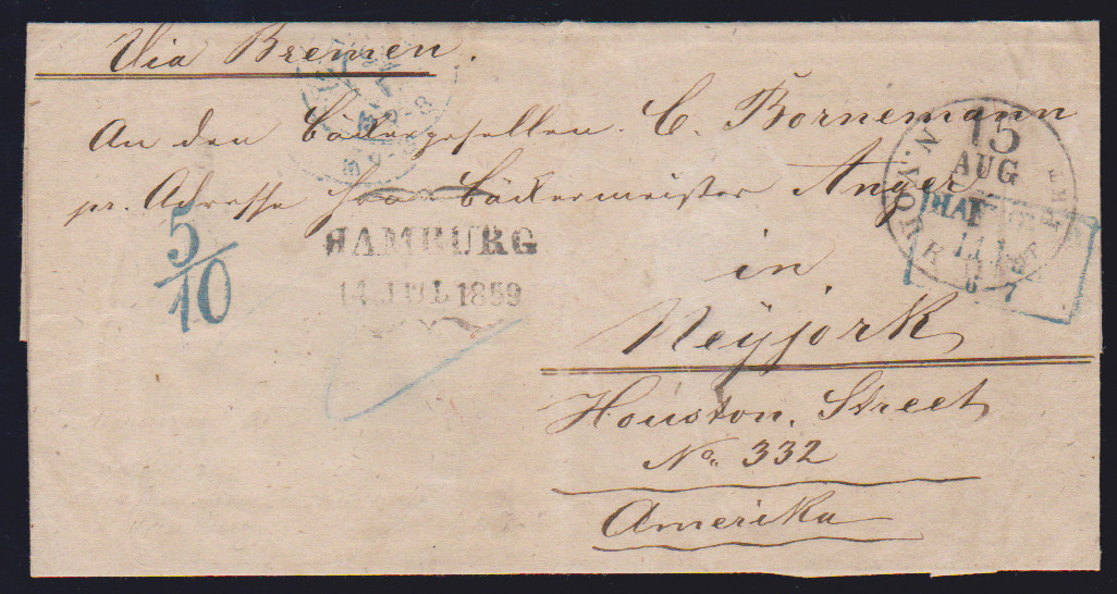 "Hannover", 1859, blauer Ra2 auf Prachtbrief "via Bremen" (rs. hann. K2) nach New York, jedoch über Hamburg gelaufen (vs. Schmetterlingsstempel) und blauer Taxstempel "5/10"