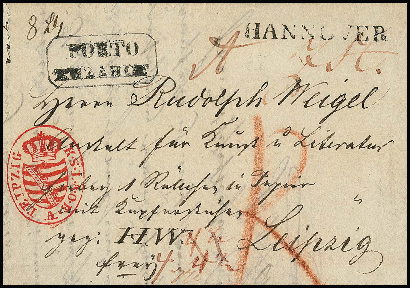 "Hannover", 1834, L1 nebst seltenem Ra2 "PORTO BEZAHLT" und dekor. rotem sächs. Zollstempel auf Paketbrief mit Kupferstichen nach Leipzig