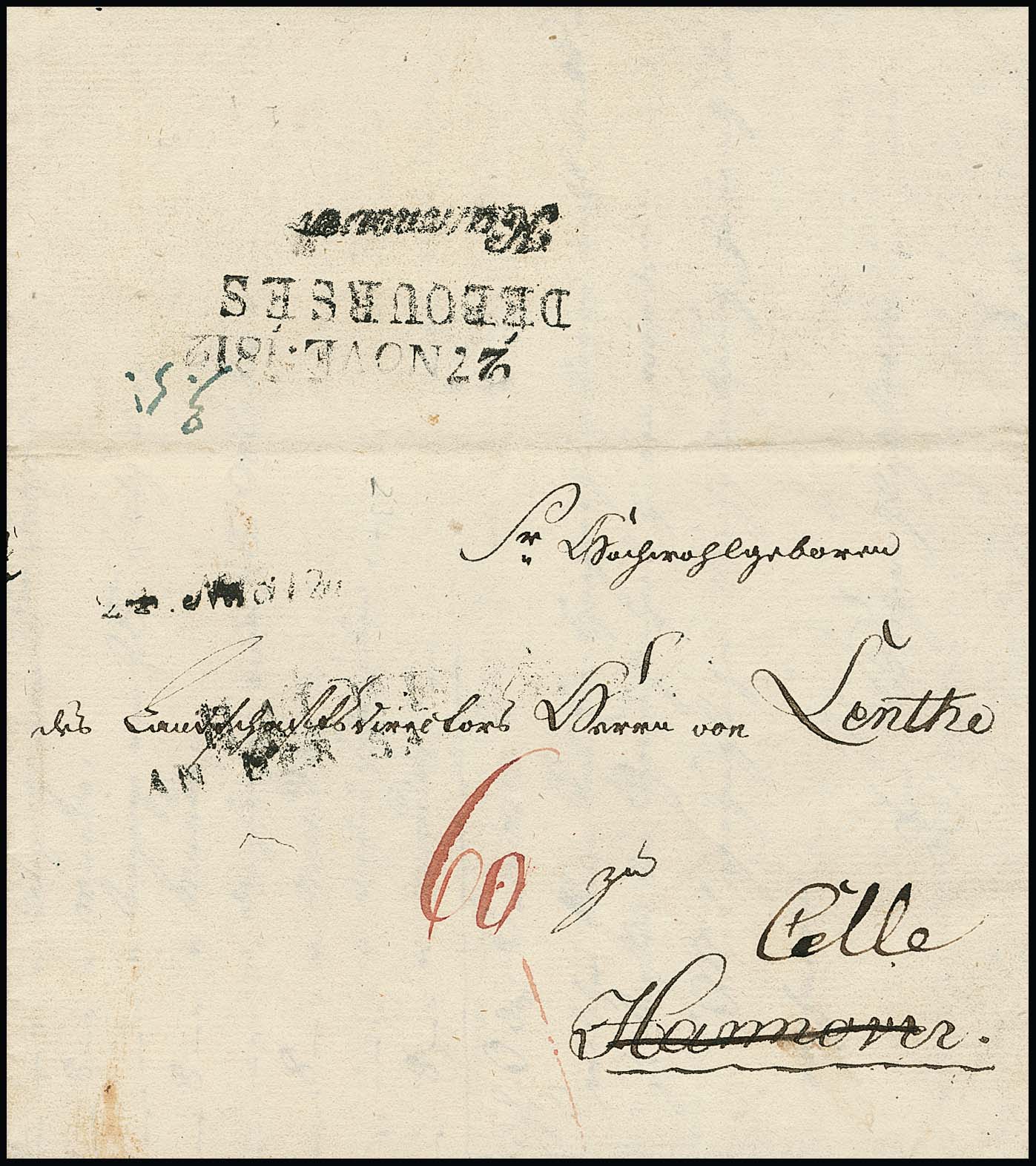 "Hannover", 1805, großer roter L1 "PAYS D`HANNOVRE R.4." nebst schwarzem L1 "BASSE SAXE" auf Prachtbrief "par D. Dorff" nach Paris