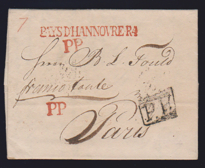 "Hannover", 1805, klarer roter L1 "PAYS D`HANNOVRE R.4." nebst doppeltem L1 "P.P." und schwarzem Ra1 "P.P." auf Kabinettbrief "Franco toute" aus Hannover nach Paris