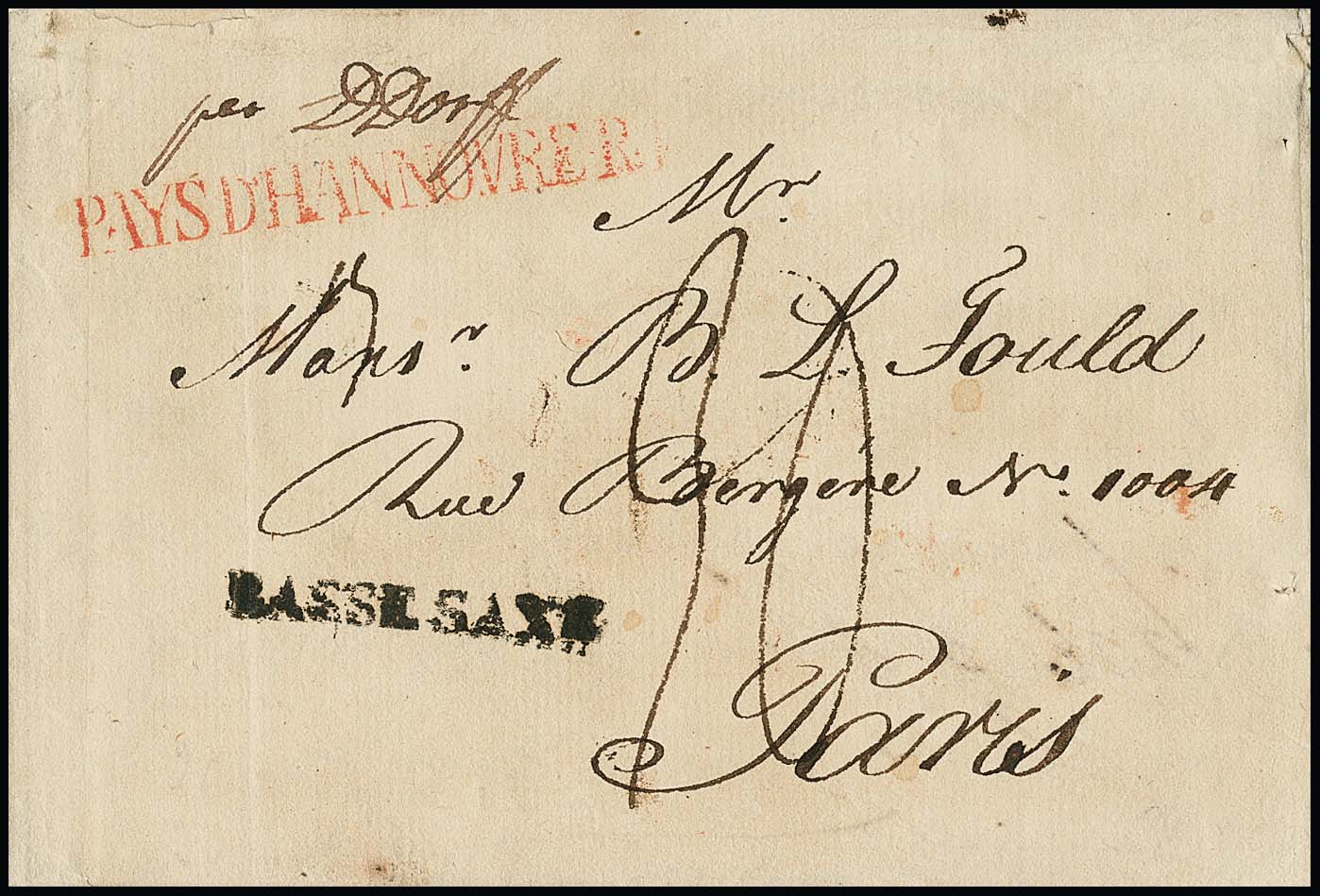 "Hannover", 1811, "PAYS D`HANNOVRE R.4." und "BASSE SAXE", je klare rote L1 auf Luxusbrief aus Hannover nach Paris