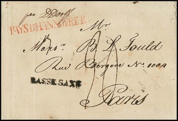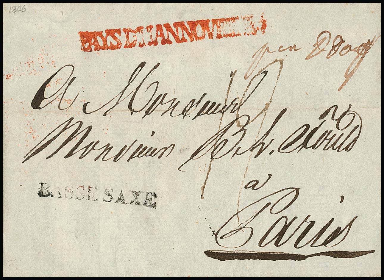 "Hannover", 1806, roter L1 "PAYS D`HANNOVRE R.4." nebst schwarzem L1 "BASSE SAXE" auf kleinem Prachtbrief aus Hannover "par D. Dorff" nach Paris