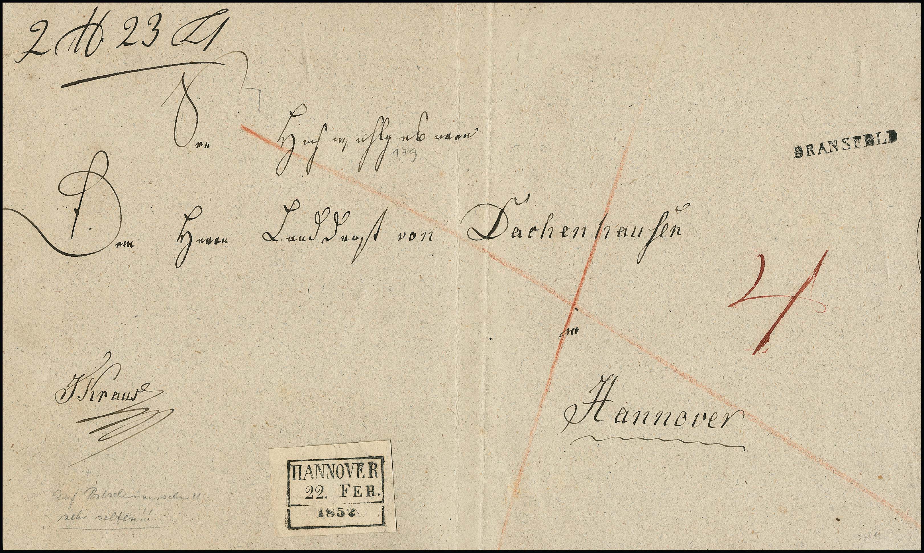 "Hannover", 1852, seltene Fahrpost-Ra3 (auf kleinem Aufkleber) auf Paketadresse (2 Pfund, 23 Loth, Vorderseite) mit L1 "Dransfeld" nach Hannover, es sind nur wenige Belege mit derartigen Grobsendungslabels bekannt