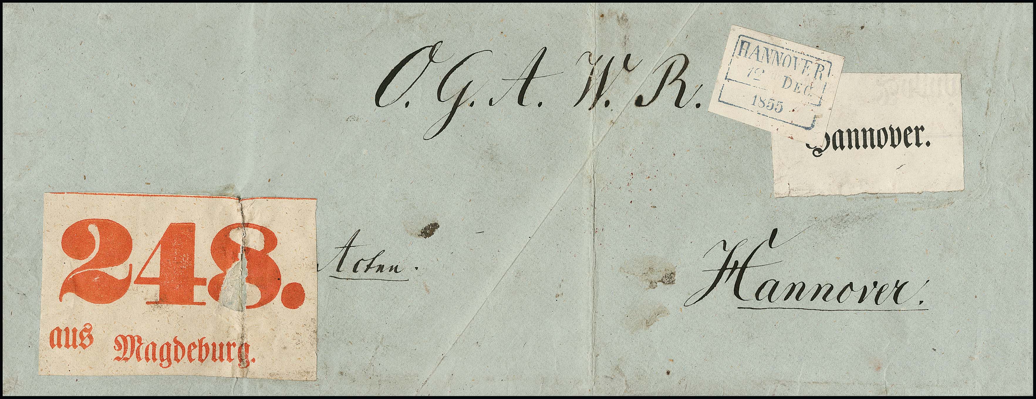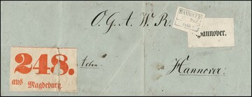 "Hannover", 1855, blauer Fahrpost-Ra3 klar auf Aufkleber nebst Bahnpost-Label "Hannover" auf großem Paketbegleitbrief mit großem Paketzettel "248. aus Magdeburg" nach Hannover, es sind nur wenige Briefe bekannt