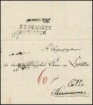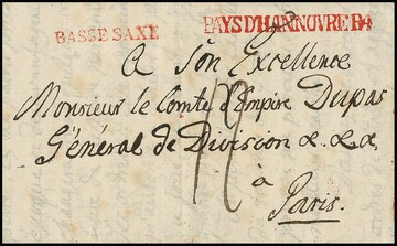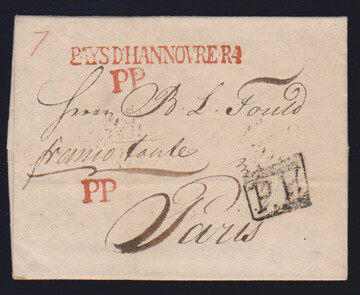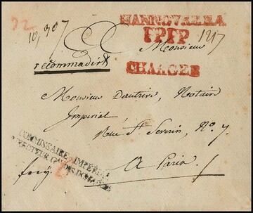 "Hannover", 1809, "HANNOVRE R.4.", "P.P.P.P." und "CHARGÉ", je rote L1 nebst schwarzem Franchise-L2, auf Couvert nach Paris, hs. "frey 0", ein seltenes Poststück