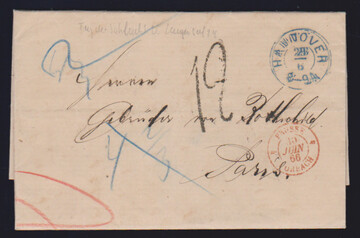 "Hannover", 1866, 28.6., u.a. blauer K2 auf Brief an Gebr. Rothschild in Paris, geschrieben während der Schlacht von Langensalza (27.-29.6.1866)