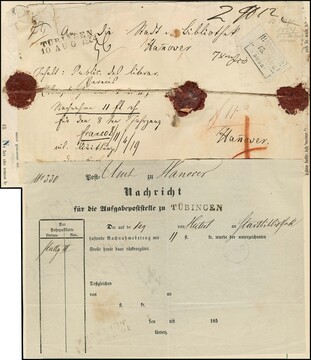 "Hannover", 1852, seltener Fahrpost-Ra3 (auf Grobsendungslabel) auf versiegelter Adresse von Nachnahme-Paketbegleitbrief mit L2 "Tübingen" nach Hannover, beiliegend ein seltenes Fahrpostformular "Nachricht für die Aufgabepoststelle zu Tübingen" (betr. Rückvergütung des Nachnahmebetrages)