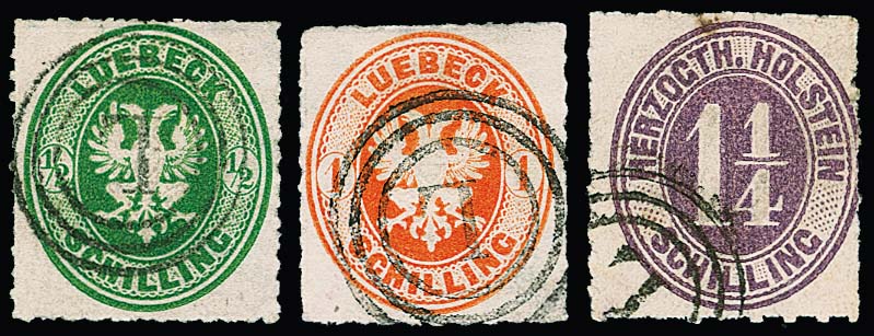 "L", der Dreiringstempel klar auf 1/2 Sch. grün und 1 Sch. rotorange, sowie auf Schleswig-Holstein 1 1/4 Sch. purpur, letztere beiden sign. Köhler