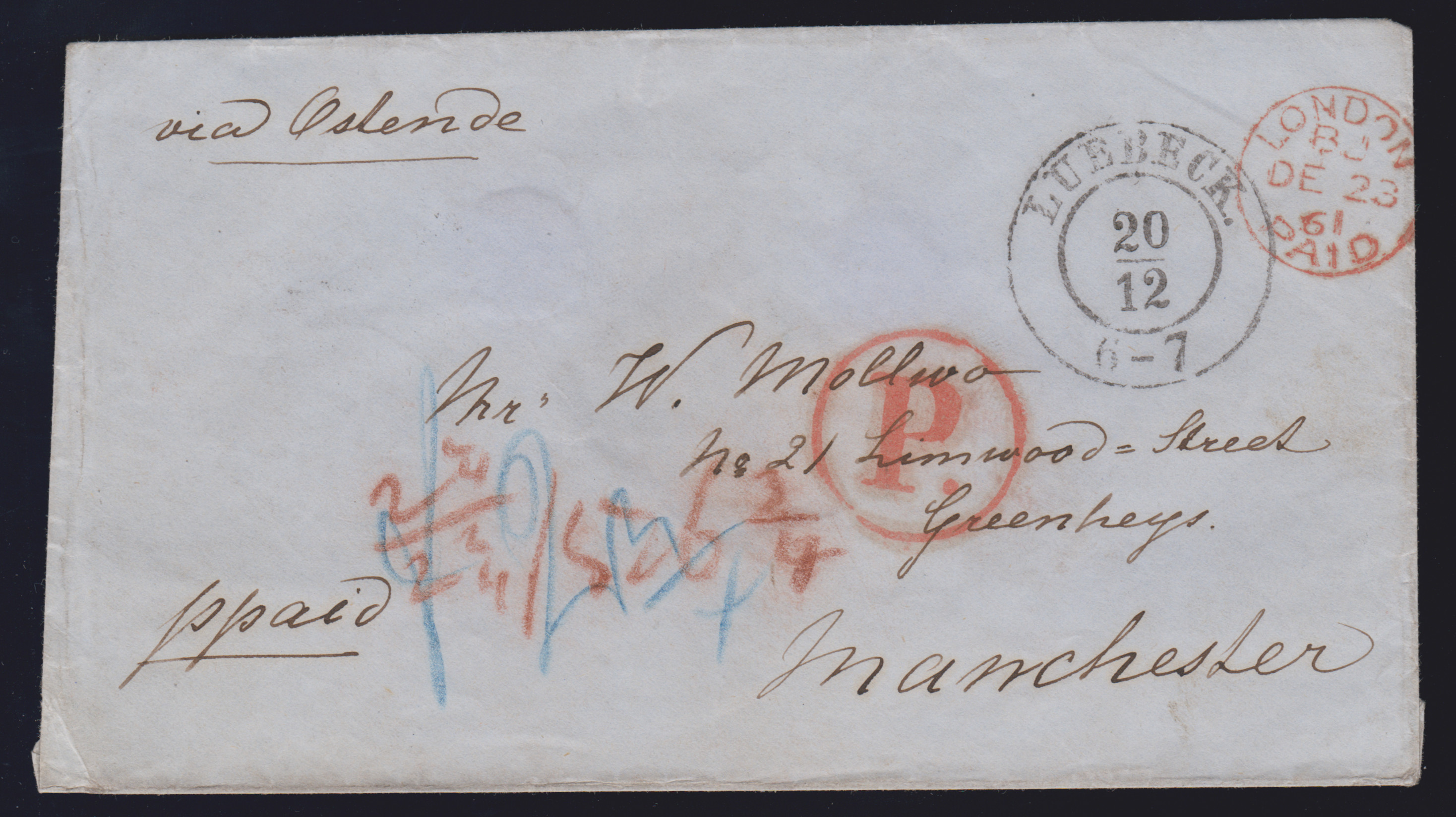 "Lübeck", 1861, K2 auf Auslandscouvert via Ostende nach Manchester/England