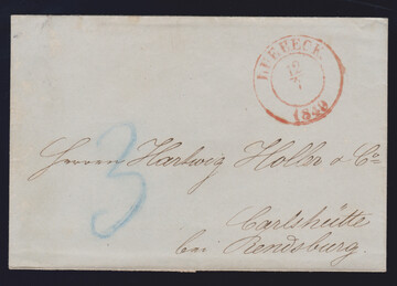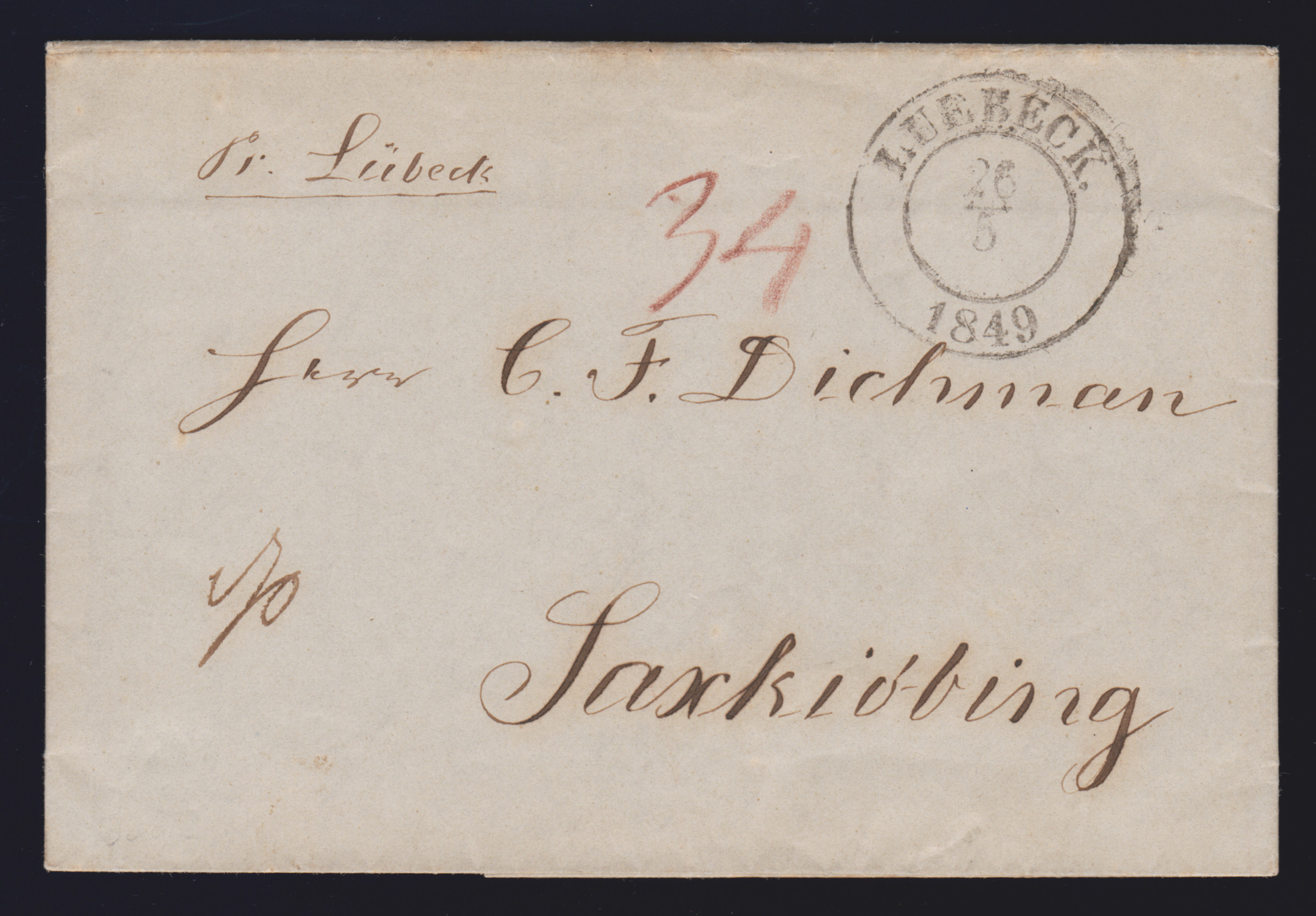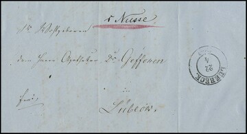 "Luebeck", 1849, seltener, nur kurz im Juli 1849 in Gebrauch befindlicher roter K2 klar auf Brief nach Carlshütte