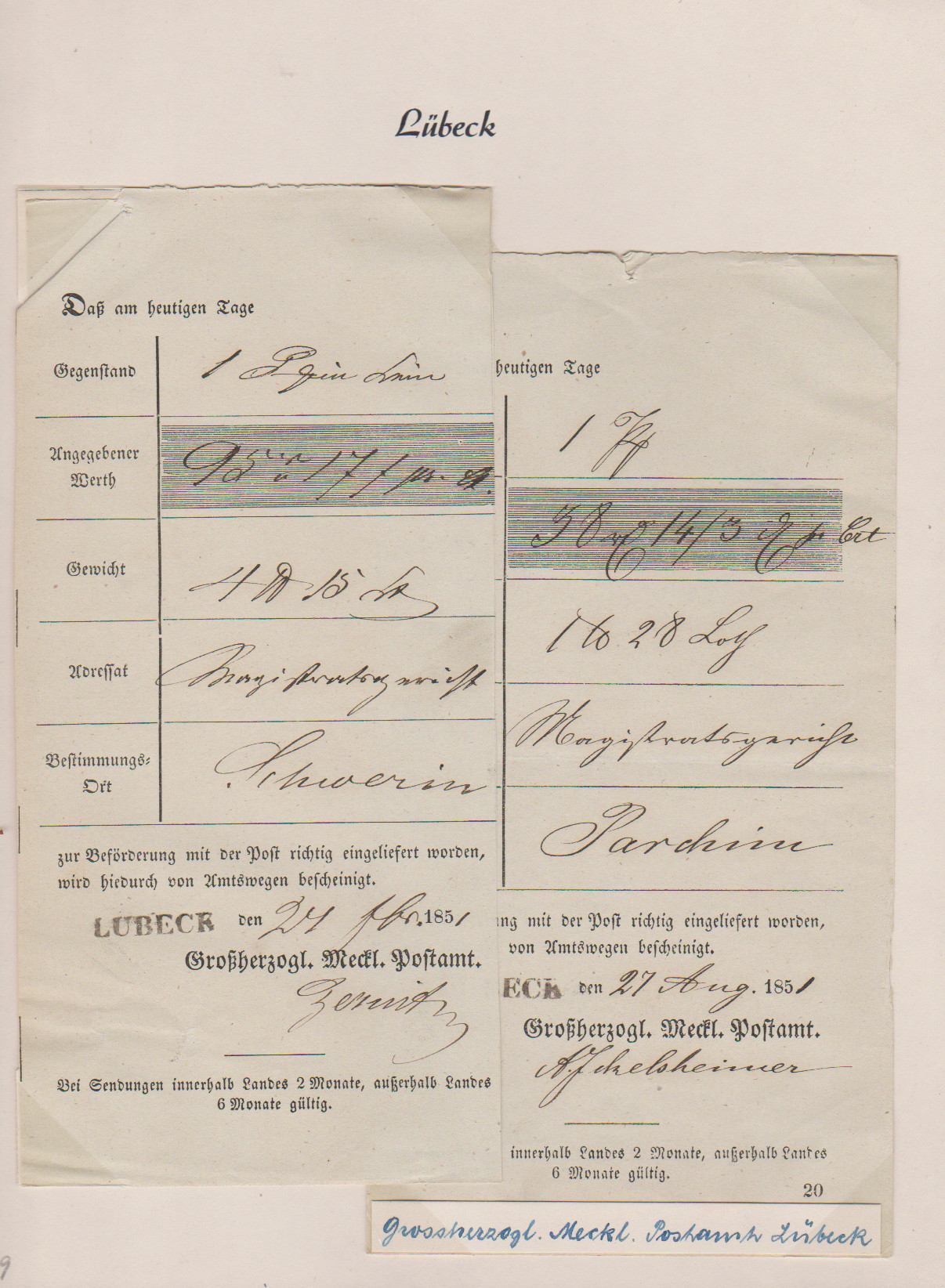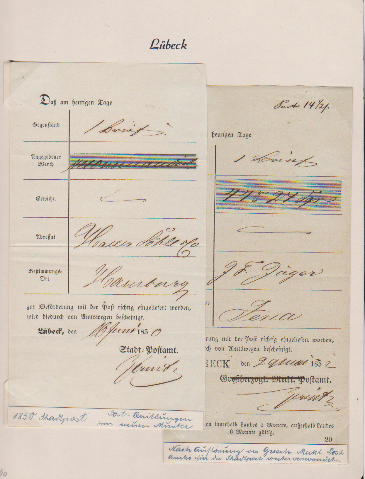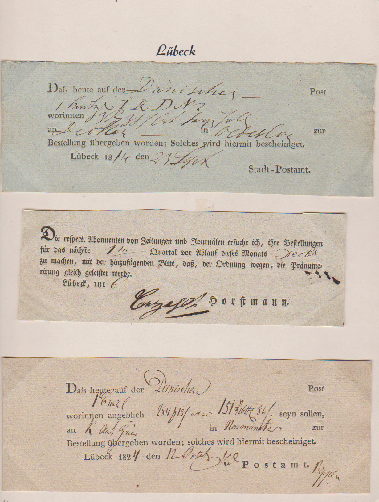 "Lübeck", ab 1814, über 20 Postscheine des Stadtpostamtes, Dän. und Mecklenburger Postamtes, dazu hs. Schein 1787, fünf Postscheine von Lübeck, eine Zeitungsrechnung und sieben Einzahlungsquittungen. Große Vielfalt mit apt. Scheinen etc. Total 37 Formulare