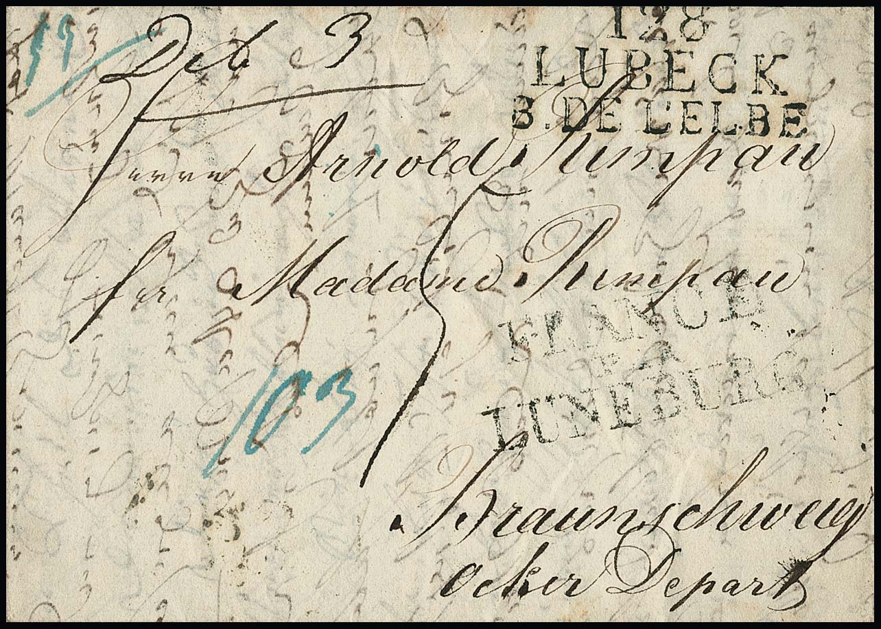 "Lübeck", 1812, klarer L3 "128 LUEBECK B. DE L`ELBE" und seltener L2 "FRANCE PAR LUNEBURG" (Feuser 1000,-) auf kleinem Prachtbrief nach Braunschweig