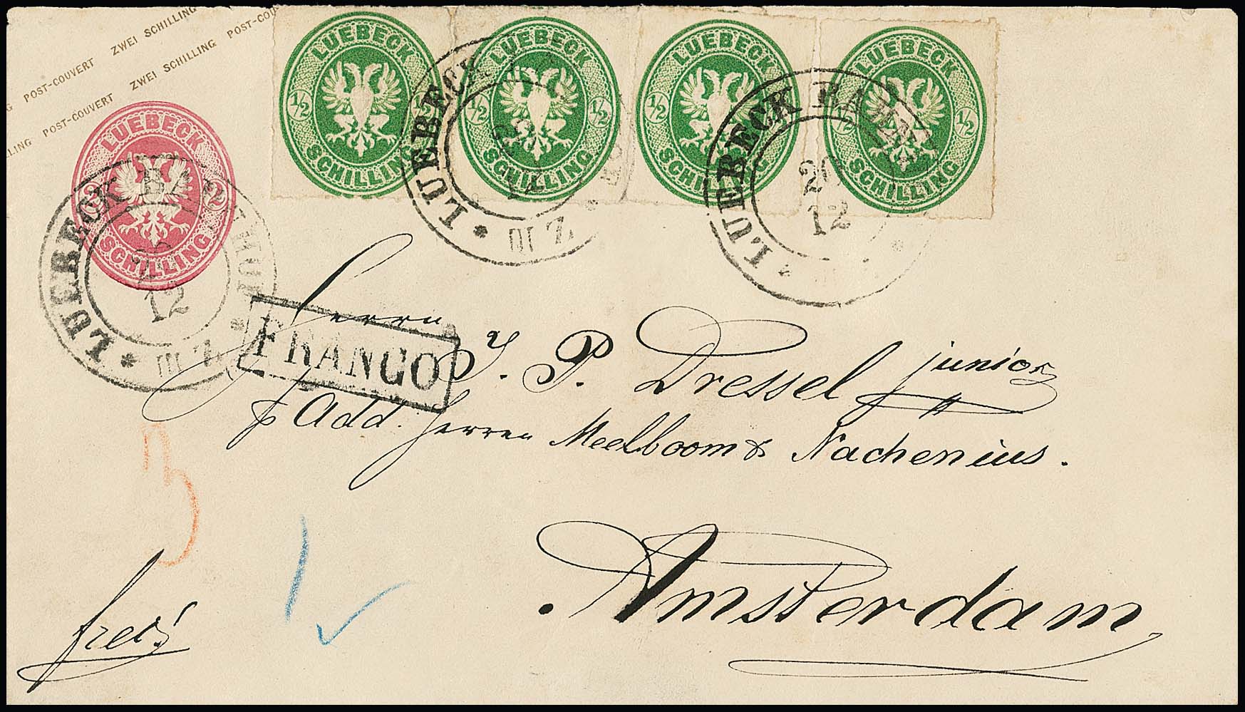 1/2 Sch. grün, vier perfekte Exemplare auf Ganzsache 2 Sch. rot, mit K2 "Luebeck Bahnhof III.Z." 1866 nach Amsterdam gelaufen. Eine ausserordentlich seltene, wahrscheinlich einmalige Kombination in sehr schöner Erhaltung, sign. Krause und Engel mit Attest "einwandfrei". Bei uns registriert seit der 49. Corinphila-Auktion 1963 (Käufer war damals Walter Engel). Foto siehe Katalog-Rückseite