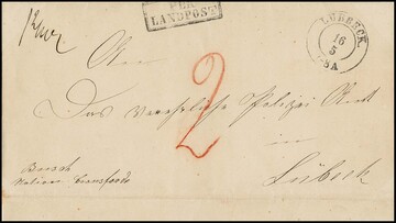 "Luebeck", (1860), K2 und seltener Ra2 "PER LANDPOST" auf Brief von der Station Cronsforde (hs.) nach Lübeck