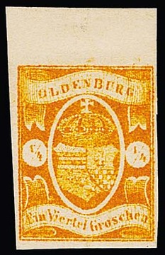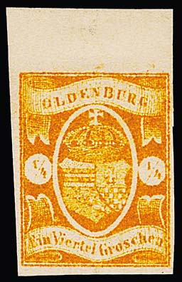 1/3 Gr. moosgrün, voll-, meist breitrandiges Kabinettstück in farbfrischer und völlig ursprünglicher Erhaltung einzeln auf Drucksache (forwarded aus Leipzig, offensichtlich aus Gründen der Portoersparnis erst in Varel aufgeliefert, Schleife nachträglich zur Demonstration) mit Ra2 "Varel". Sign. Pfenninger, Friedl und Attest Brettl: "Große, begehrenswerte Oldenburg-Rarität, nur wenige Einzelfrankaturen bekannt". Tatsächlich gibt es nur sechs Einzelfrankaturen der Nr. 10b, davon das vorliegende Stück aus den Sammlungen Adler (Harmers/New York 1961, Zuschlag 320,- US-Dollar. Zum Vergleich: den gleichen Preis erzielte das Paar Oldenburg Nr. 9 auf Brief aus der Koch-Slg. in der gleichen Auktion) und Hubertus Lange (Zuschlag 2011 Euro 5400,- + Aufg.). Mi. 25.000,-