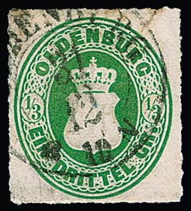 1/3 Gr. grün, guter weiter Durchstich "10", unten schwache Bugspur (von der Streifband-Verwendung) mit hierauf seltenem Letzttags-K2 "Oldenburg 31.12." (1867) in schwarz. Sign. Engel und Attest Stegmüller. Mi. 1000,- +