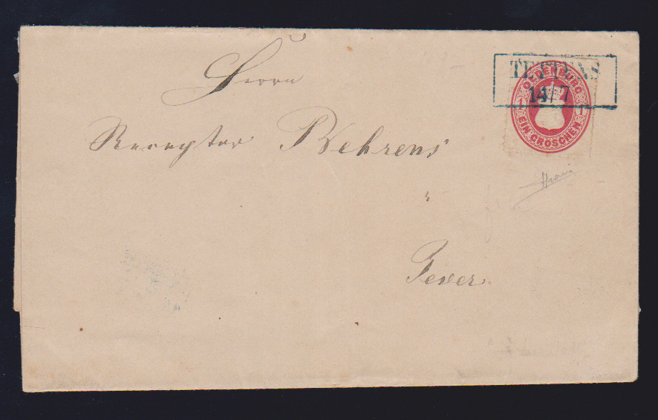 1 Gr. rosa auf Kabinettbrief mit Ra2 "Tettens", sowie 3 Gr. ockerbraun auf Kabinettbriefstück mit Ra2 "Varel" (sign. Berger)