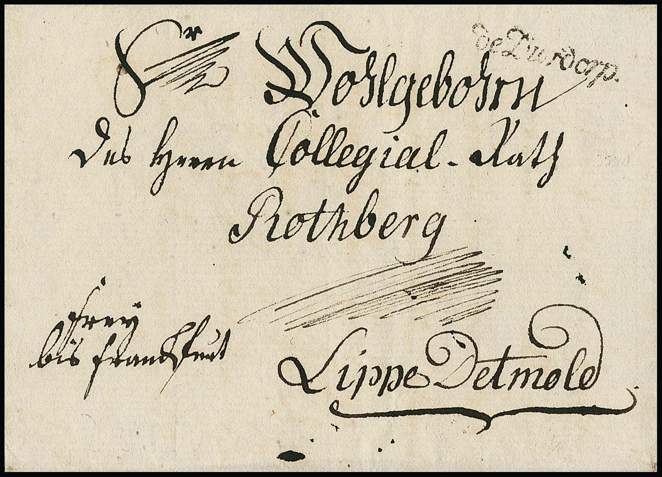 "Dierdorf", (1790), Schreibschrift-L1 "de Dierdorp." klar auf Brief mit Teilinhalt nach Lippe-Detmold. Der Stempel ähnelt der Type Nr. 1 (1200,- Euro) bei Feuser, ist jedoch in anderer Typographie und Schreibweise und das bisher einzig bekannte Belegstück für diesen Stempel. Zuletzt versteigert 100. Rauhut 2006