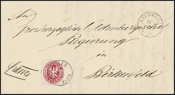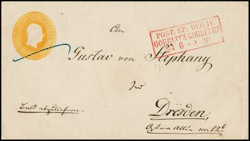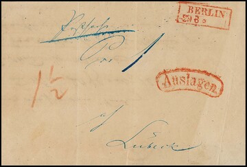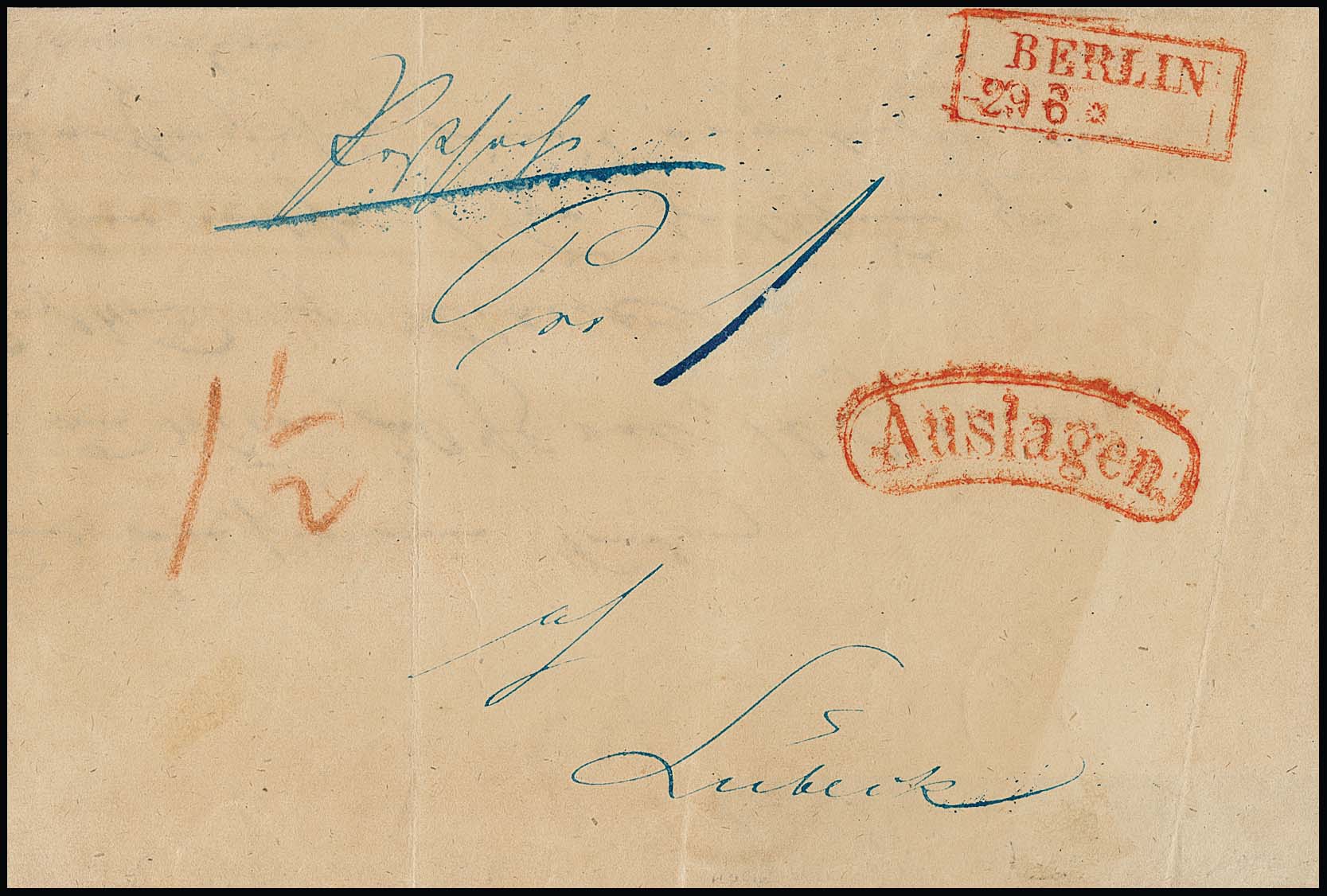 "Berlin", 1856 (29. Juni), der rote Ra2 des Hofpostamtes, mit offener Rosette und teilaptiert ohne Uhrzeit, als Aufgabestempel verwandt auf Postsache des Hofpostamtes (Nachforderung von 1 Sgr. Gebühr für einen Zollschein nach Lübeck per "Auslagen"). Bisher war dieser Stempel in rot nur einmal als Aufgabestempel registriert (Kuphal-Slg., Zuschlag DM 3000,-), dies ist das zweite bekannte Belegstück und Stempelrarität von Berlin. KHBW 32, "LP", Kruschel Seiten 184/185