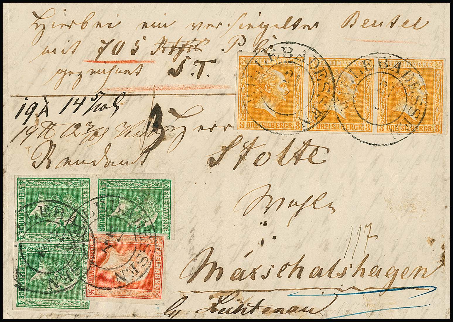 1/2 Sgr. ziegelrot, Paar und Einzelstück 4 Pfge. grün sowie Dreierstreifen 3 Sgr. orange auf Wert-Paketbegleitbrief mit vorphil. K2 "Willebadessen" nach Marschalshagen bei Lichtenau. Das Paar der 4 Pfge. rechts berührt (unauffällig), sonst alle Marken voll- bis breitrandig. Dekorative Anordnung der Frankatur, sowohl seltene Kombination als auch sehr späte Verwendung der Nr. 1 in 1862. Portogerecht mit 10,5 Sgr., hiervon 10 Sgr. für den Paketbegleitbrief in der 3. Entfernungsstufe mit knapp 20 Pfd. = dreimal 20 mal 2 = 120 Pfg. (also 10 Sgr.) plus 6 Pfge. für die Wertangabe unter 50 Thalern. Ein altbekanntes Stück aus den Sammlungen Blecher, Müller und Metzer, zudem Titelfoto des Preußen-Rundbriefes Nr. 168. Sign. Meier, Kruschel, Banker
