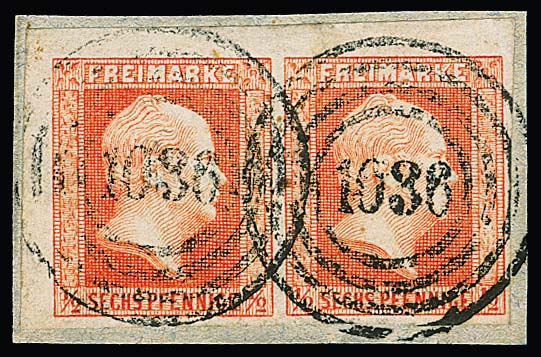 1/2 Sgr. ziegelrot im Paar aus der linken oberen Bogenecke auf Kabinettbriefstück mit NS "1036" (Neustettin), sign. Engel