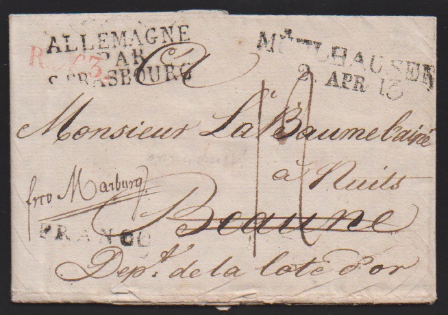 "Mühlhausen. Harz DP.", 1808, 10.8., klarer, bislang unbekannter provisor. westphäl. L1, nebst L1 "R.1.FRANCFORT" und L3 "ALLEMAGNE PAR STRASBOURG" auf Brief nach Beaune, dazu Brief aus gleicher Korrespondenz mit L2 "MÜHLHAUSEN 2. APR. 13", ein Unikat von Liebhaberwert (Feuser nicht gelistet)
