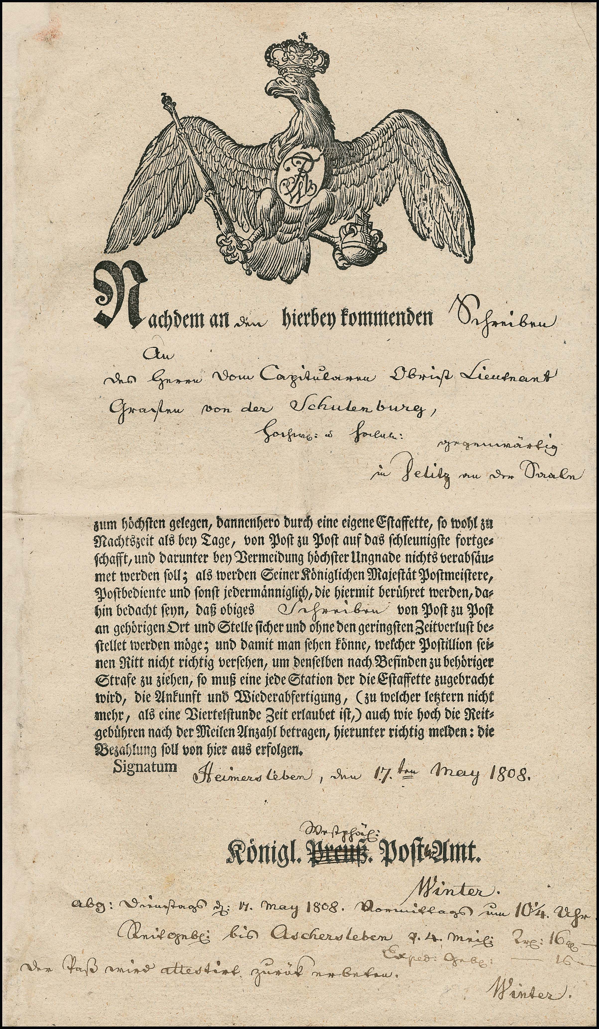 "Heimersleben", 1808, "Königl. Preuß. Post-Amt" (hs. geändert in "Westphäl. Postamt"), sehr seltener Estaffettenpass (mit großem preuß. Adler) für eine Sendung an den "Capitularen Obrist Lieutnant Grafen von der Schulenburg, gegenwärtig in Delitz an der Saale", nach Hornhausen, mit den Quittierungen der Postämter Aschersleben, Cönnern und Halle a.S. (unauffällige Papierausbesserungen am linken Blattrand, Doppelfolio). Gerhard von Schulenburg (1763-1818) übernahm den Vorsitz des Wahlkollegiums des Ober-Departements und war 1808 und 1810 Präsident der Reichsstände des Königreiches Westphalen. König Jeromé Bonaparte hatte 1807 vergebens versucht, ihn für den Staatsdienst zu gewinnen