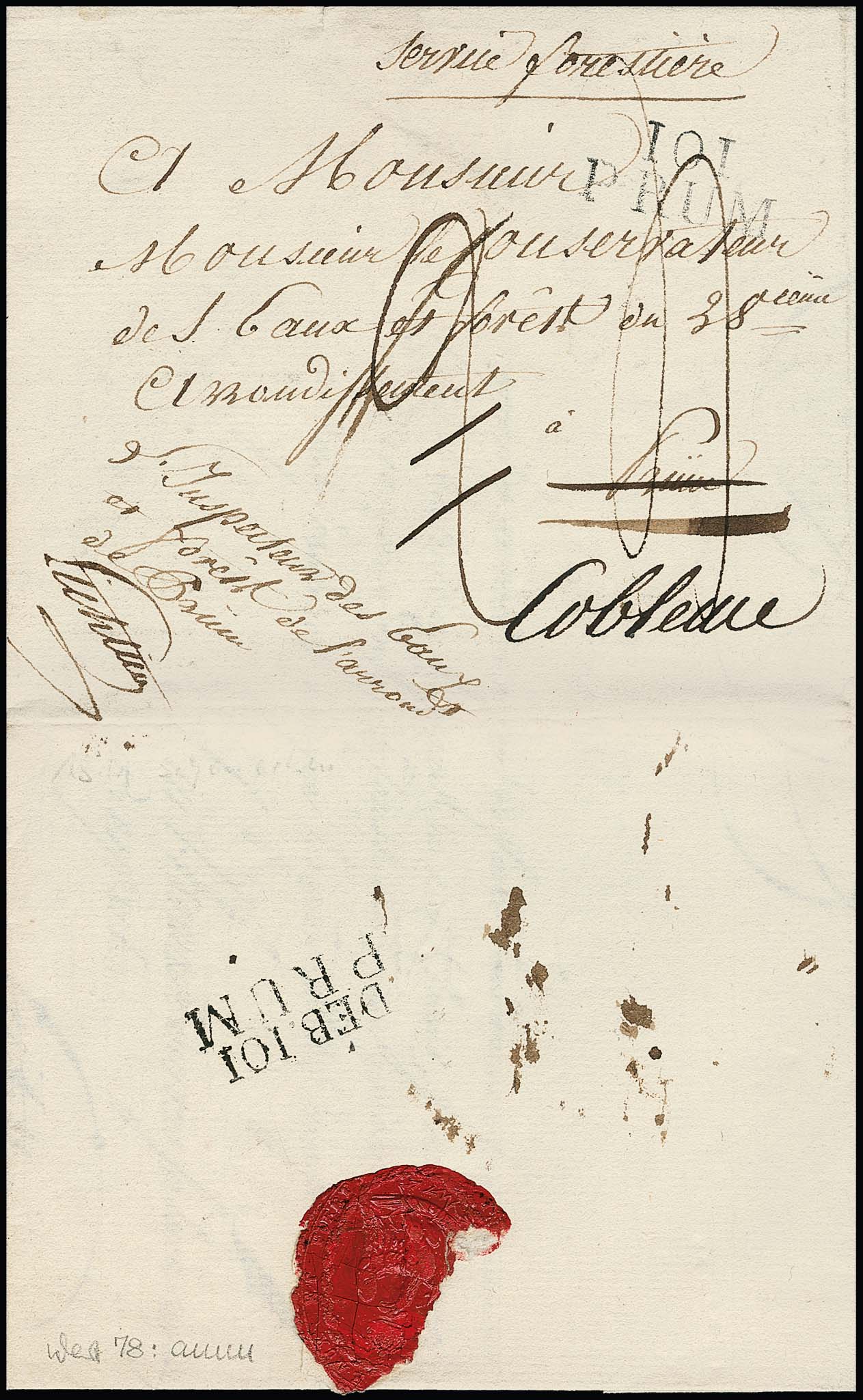 "Prüm", 1812, "101 PRUM" und rückseitig "DÉB. 101 PRUM", klare L2 auf interessantem, versehentlich nach Prüm statt nach Coblenz adressiertem Retourbrief, der Deboursé-Stempel von Prüm ist eine große Vorphila-Rarität!