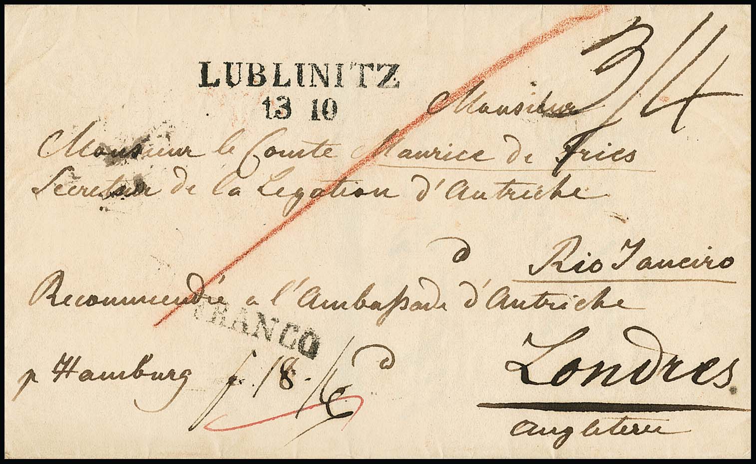 "Lublinitz", 1830, L2 auf sehr frühem Südamerika-Brief nach Rio de Janeiro/Brasilien, adressiert an einen Grafen der Österreichischen Gesandschaft in Rio, gelaufen "Recommandé" über die Adresse der Österreichischen Botschaft in London