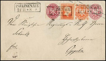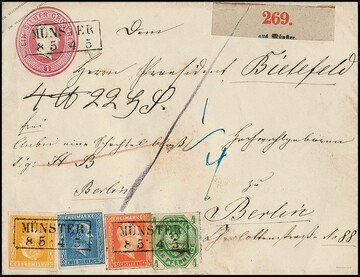 1/2 Sgr. rotorange, 2 Sgr. tiefblau (Plattenfehler "heller Fleck in der rechten Rosette", Handbuch G2) und 3 Sgr. orange in Mischfrankatur mit Wappen 4 Pfge. grün auf großformatiger Kopf-Ganzsache 1 Sgr. rosa, mit Ra2 "Münster" als Paketbegleitbrief nach Berlin. Die 4 Pfge. hat unten einen verklebten Randfehler, die drei Kopfmarken sind einwandfrei (3 Sgr. etwas "Lupenrand"). Eine einmalige Fünffarben-Frankatur-Kombination an bekannten Empfänger "Bielefeld" von dekorativer Optik. Sign. Pfenninger, Banker