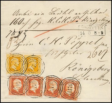 1/2 Sgr. ziegelrot, zwei Paare in Mischfrankatur mit Paar 3 Sgr. orange auf Paketbegleitbrief (drei Falten ausserhalb) mit NS "1170" und Ra2 "Proeculs" nach Königsberg. Alle Marken voll- bis breitrandig. Attest Brettl: "Eine seltene Frankatur in schöner und feiner Gesamterhaltung."