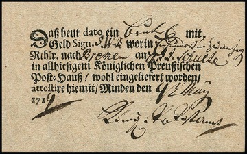 "Minden", 1709, "königlichen Preußischen Posthaus", ausserordentlich früher Ortsdruck-Postschein (wohl einer der frühesten gedruckten deutschen Postscheine überhaupt), sowie 1714 ("Post-Hauß") und 1726 in größerer Typographie, gesamt drei verschiedene, sehr seltene Ortsdruck-Postscheine