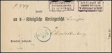 "Berlin Post-Exp. 9 Potsdamer Bahnh.", violetter (!) Ra3 vom 23.11.1864 klar zweimal auf frischem Post-Ins.-Document (rechts minimale Randschürfung). Der Stempel ist in violett nur von diesem Tag bekannt, wohl Unikat!