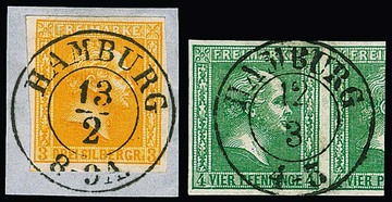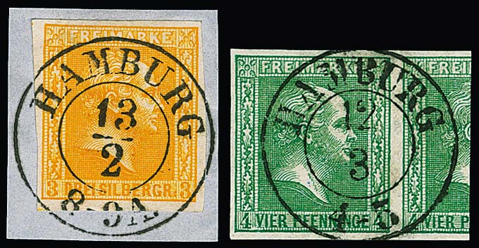 4 Pfge. bläulichgrün (mit halber Nebenmarke!) und 3 Sgr. orange (Briefstück), je Luxusstücke mit K2 "Hamburg"