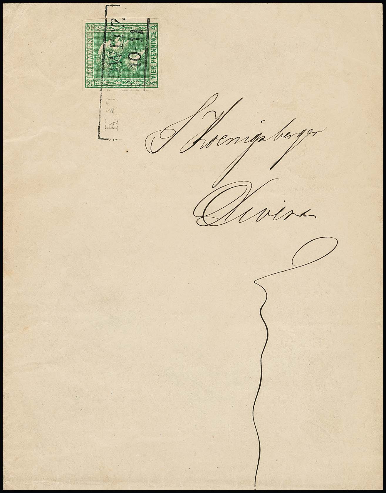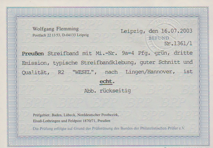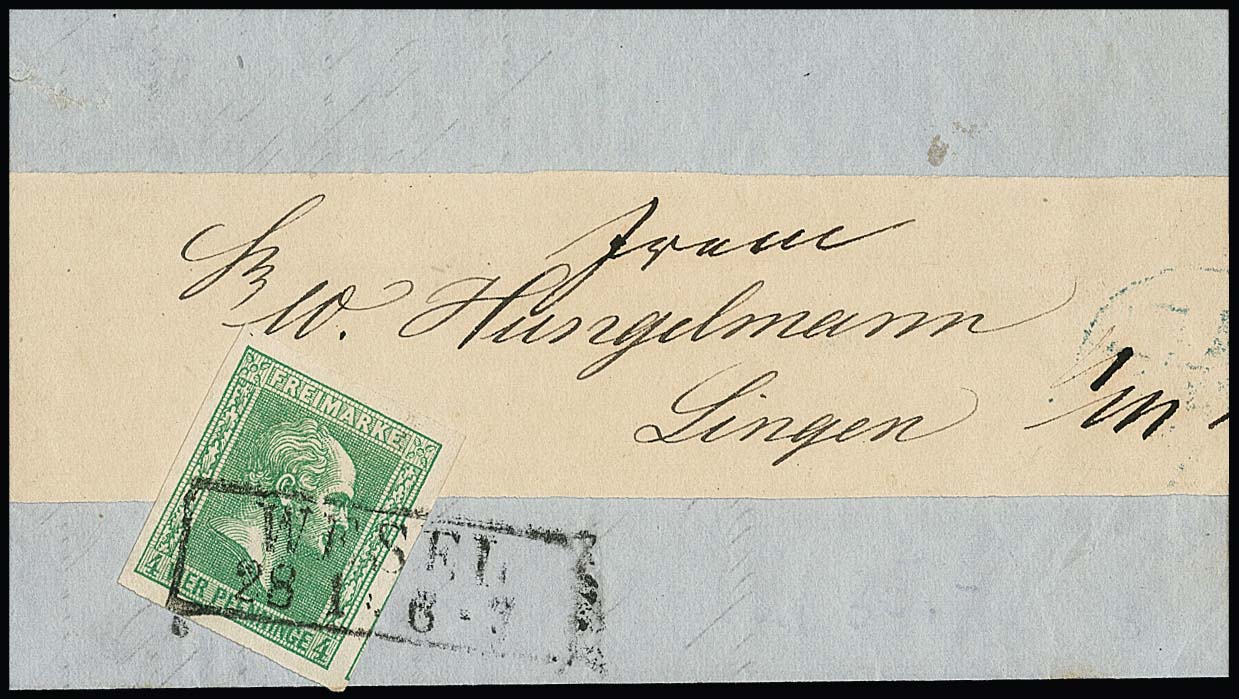 4 Pfge. grün, breitrandiges Kabinettstück auf Drucksache (Inhalt und Schleifen-Adresse) mit Ra2 "Wesel", Fotoexp. Flemming