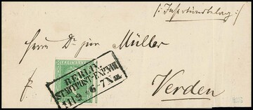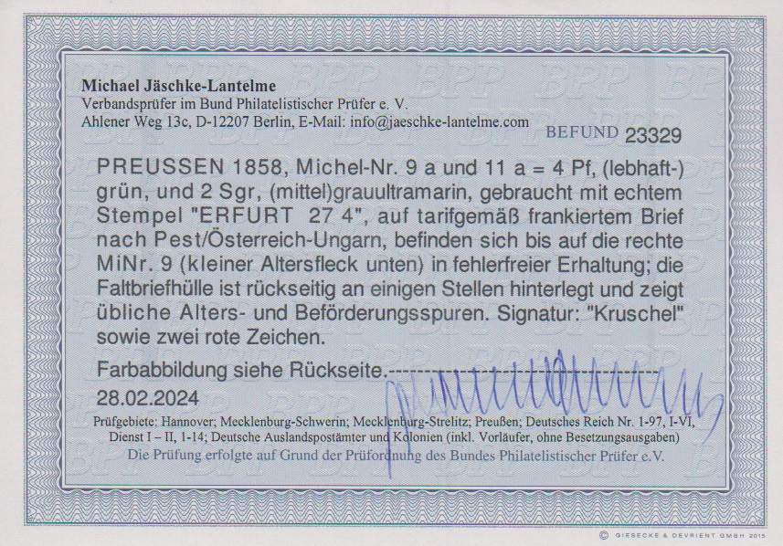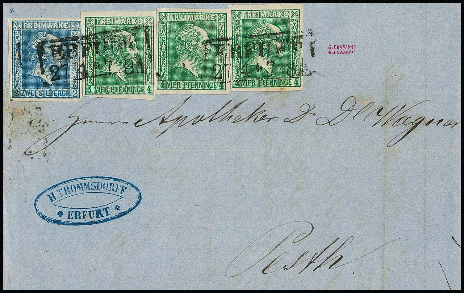 4 Pfge. grün, drei gut geschnittene Exemplare (rechtes belanglose Tönungsstelle am Unterrand), nebst 2 Sgr. blau als ungewöhnliche Darstellung des 3-Sgr.-Postvereins-Portos auf Faltbrief mit Ra2 "Erfurt" nach Pesth/Ungarn. Sign. Banker, Kruschel sowie Fotoexp. Jäschke-L.