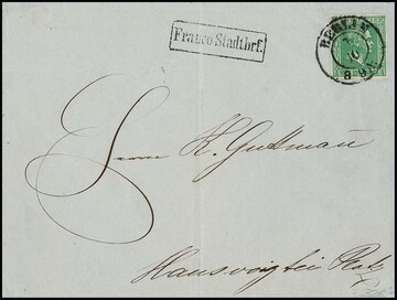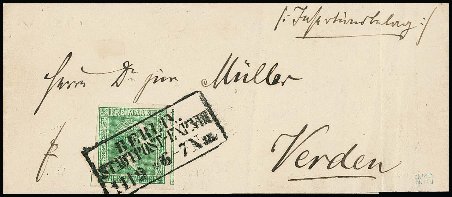 4 Pfge. grün einzeln auf gef. Kabinett-Ortsbrief (moderiertes Porto bei der Auflieferung von mindestens 100 Ex.) mit K2 "Berlin" und Ra1 "Franco Stadtbrf.", ex Metzer, sign. Kruschel, im Michel nur mit "-.-" bewertet