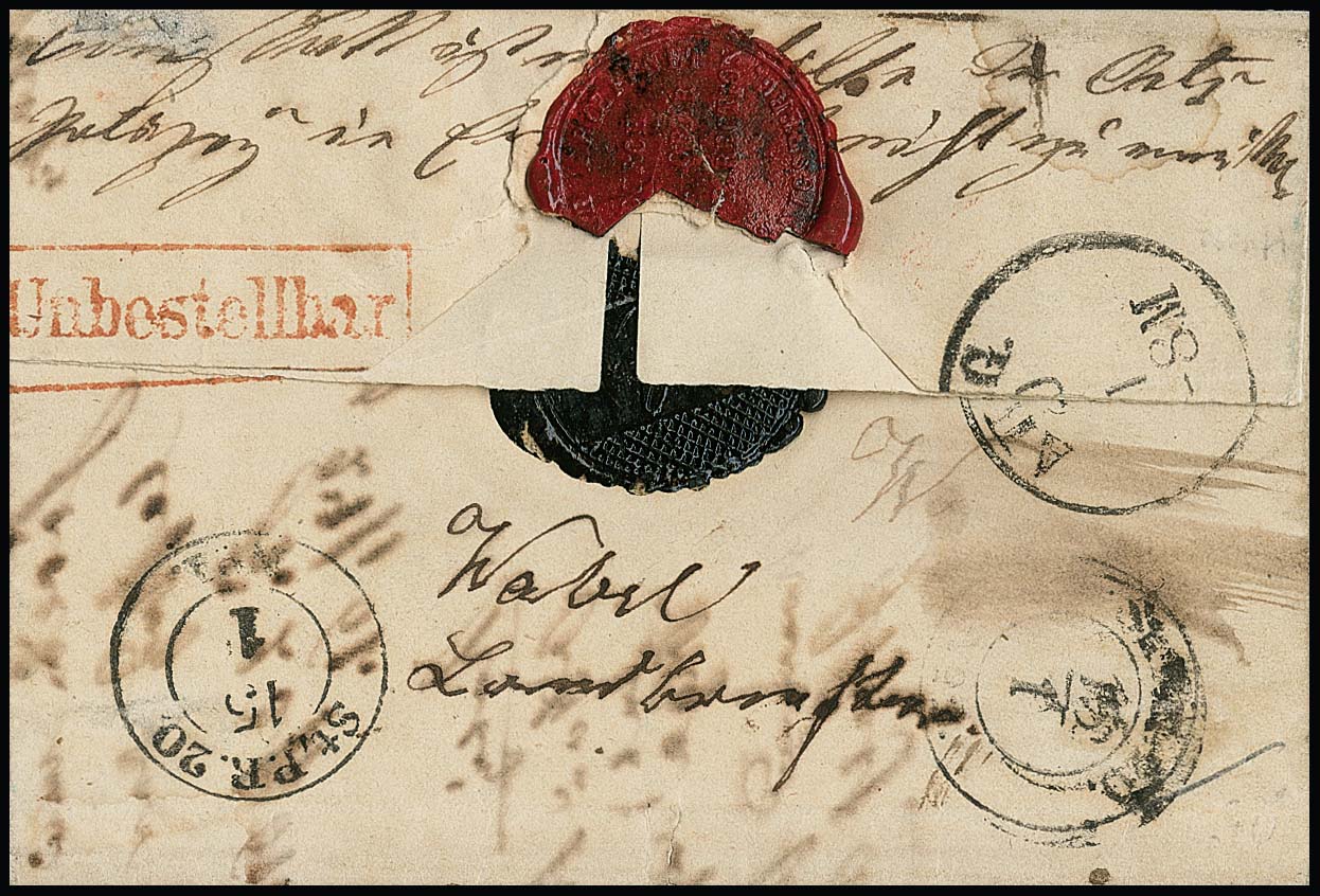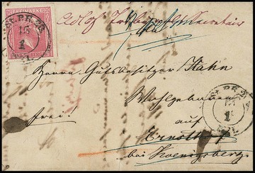 1 Sgr. lilarosa, Prachtstück einzeln mit hierauf guter Entwertung durch K2 "St. P. R. No. 1" auf Retourbrief von Königsberg in den eigenen Landbezirk nach Ernsthof und mit rückseitigem rotem Ra1 "Unbestellbar" sowie dem Eröffnungssiegel der OPD retour. Ungewöhnliches Poststück mit seltener Entwertung