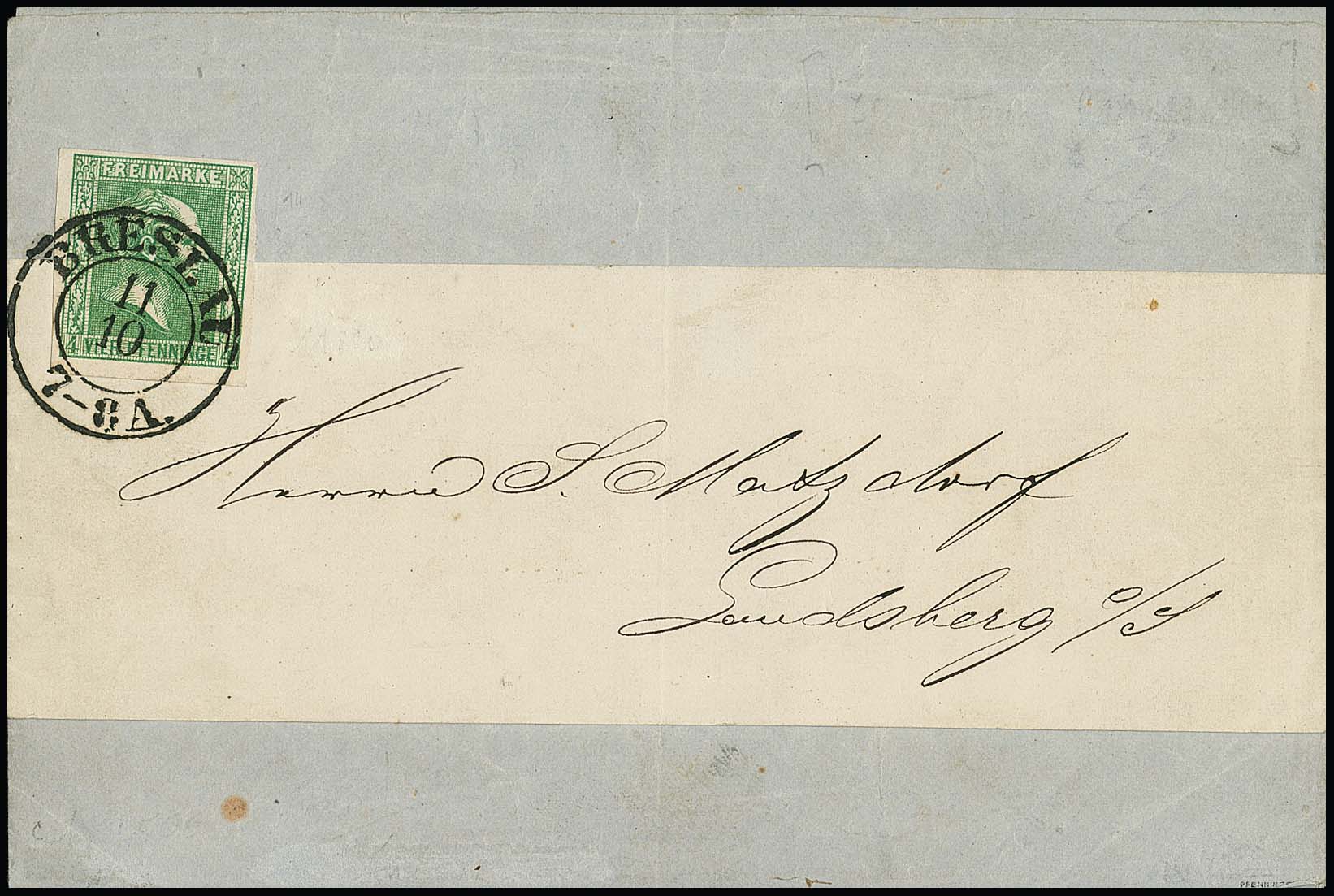 4 Pfge. grün, perfektes Exemplar auf kompletter Drucksache (Streifband und Inhalt) mit K2 "Breslau"