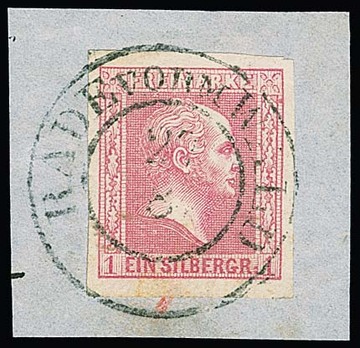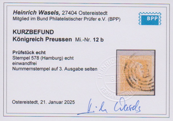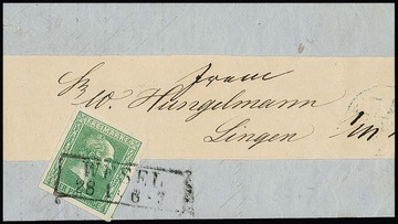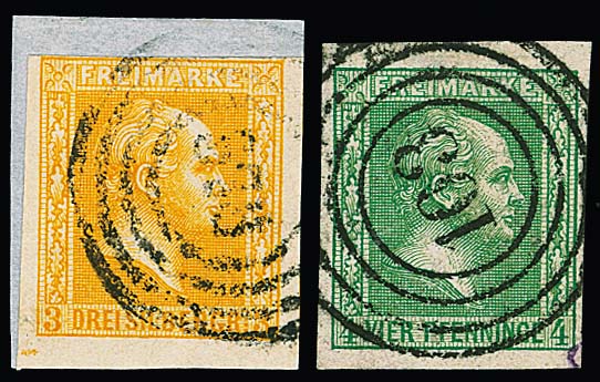 4 Pfge. grün (NS "103") sowie 3 Sgr. orangegelb (Briefstück mit NS "578"), zwei Kabinettstücke mit jeweils hierauf seltener Nummernstempel-Entwertung, je Fotoexp. Wasels. Mi. 700,-