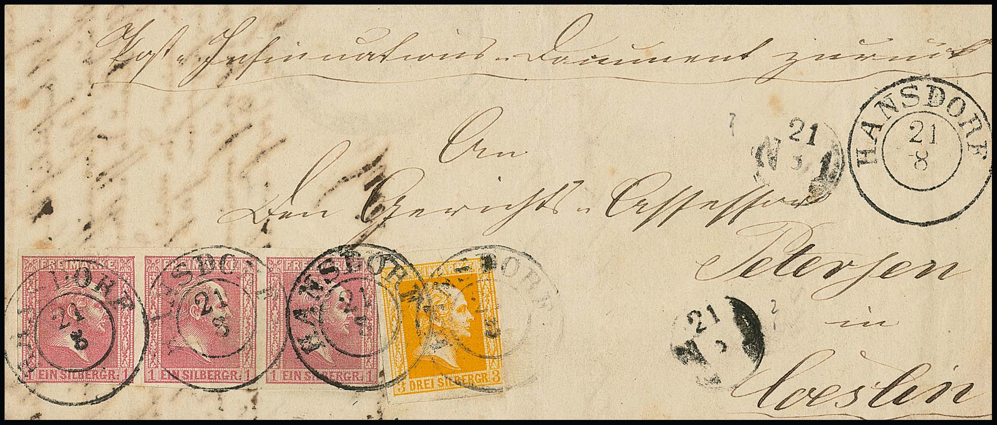 3 Sgr. dunkelorange, rechts Schnittfehler, nebst waager. Dreierstreifen 1 Sgr. rosa (eine Marke leicht berührt) als seltene Kombination mit vorphil. K2 "Hansdorf" auf Vorderseite von Post-Ins.-Doc. nach Cöslin