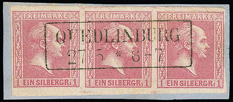 1 Sgr. hellrosa, waager. Dreierstreifen auf Luxusbriefstück mit idealen Ra2 "Quedlinburg"